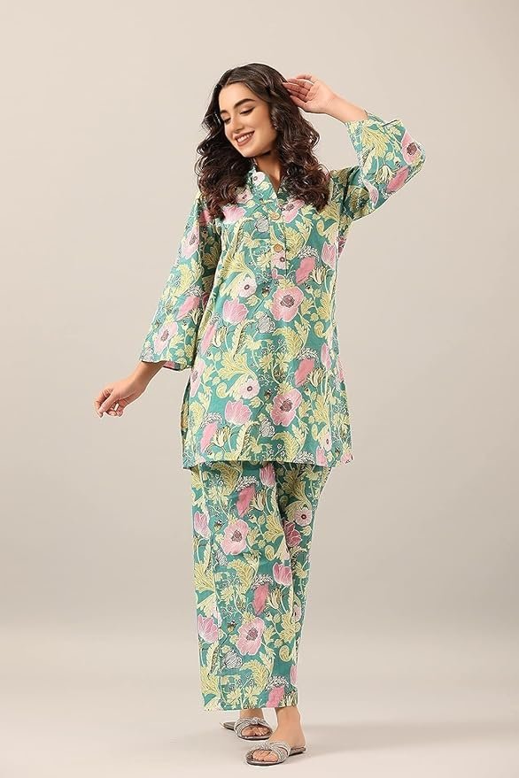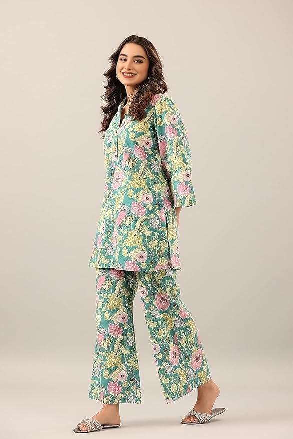 Women’s Trendy Printed Cotton Blend Straight Light Green Color Kurta and Palazzo Set